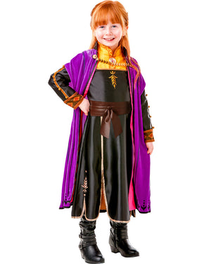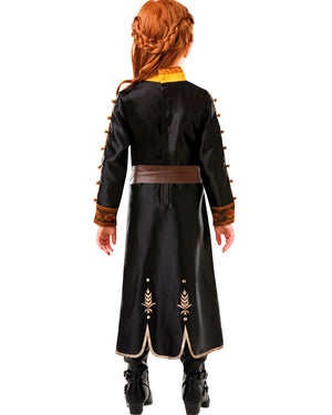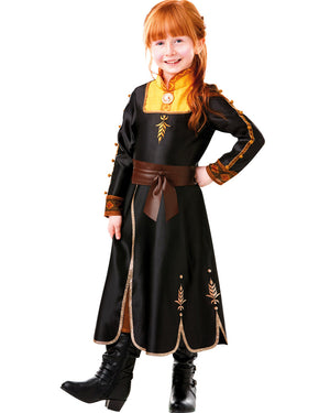 Discover the mysteries of the ancient forest with Elsa and friends in this Frozen 2 Anna Premium Girls Costume. Inspired by the travelling dress worn by Anna the Princess of Arendelle in Frozen 2. Featuring a digitally printed black matte dress, embroidered with wheat designs, a gold standup collar with a 3D rose gold brooch and long sleeves with light brown printed cuffs. The costume comes complete with a faux brown thick leather belt, and a detachable long purple clock with a gold braid clasp and printed buttons.