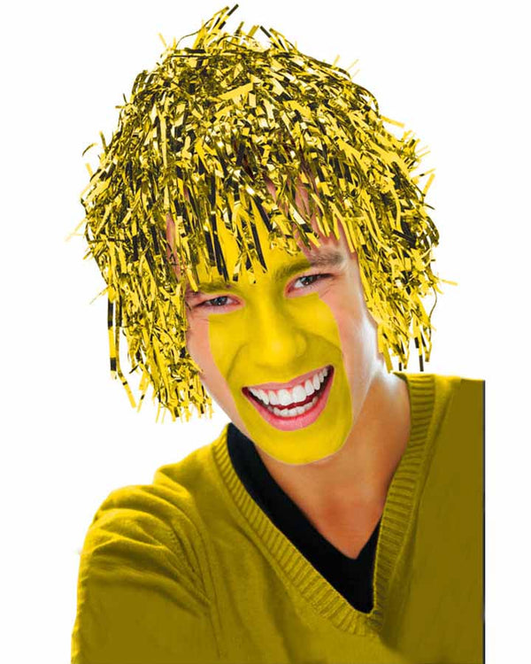 Calling all sports fans! Show your spirit as your team foils its opponents with this "fan"tastic Fun Tinsel Gold Wig. Each wig is constructed of foil strands stitched into a paper cap complete with an elastic band for a comfortable fit and is available in your favourite team's colour. One size fits most.