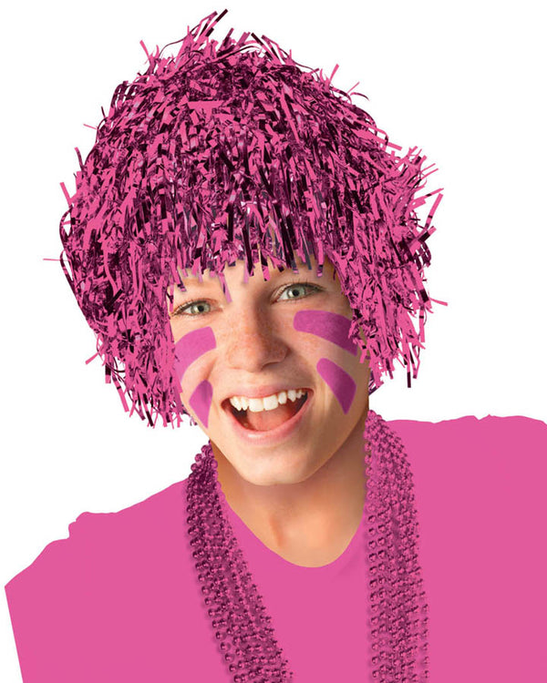 Calling all sports fans! Show your spirit as your team foils its opponent with this "fan"tastic Fun Tinsel Pink Wig. Each wig is constructed of foil strands stitched into a paper cap complete with an elastic band for a comfortable fit and is available in your favorite team's color. One size fits most.