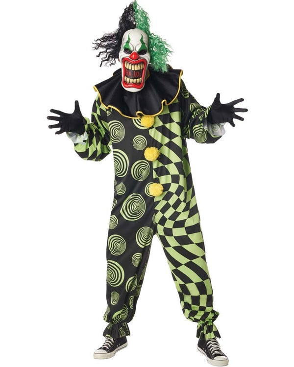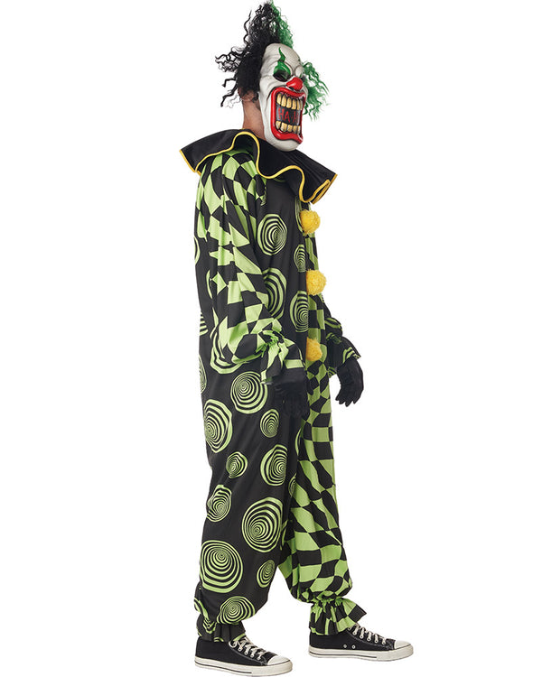 This is one fella you don't want to meet when traveling through the circus, so give the other guests nightmares for days when you wear this Funhouse Freak Mens Costume for Halloween. This scary costume includes a black and green baggy jumpsuit with swirling patterns on the right side and on the left is an abstract checked design. The jumpsuit also features three yellow pom pom buttons down the front. The costume also comes with a large black with yellow edged frilled collar and a large clown half mask. The mask features a white face with a large open mouth grin which large yellow teeth, green paint around the eyes, a painted red nose and attached at the top and sides is green and black curly hair.