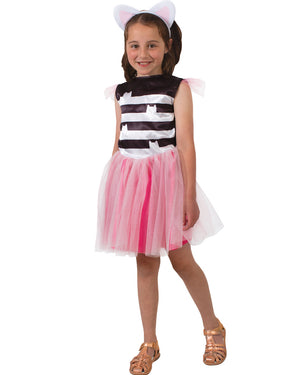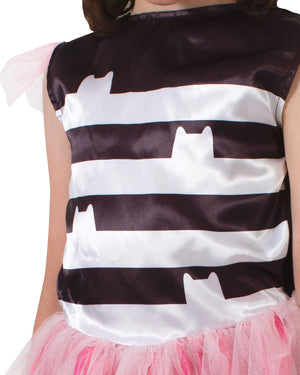 If you love the tv series Gabby's Dollhouse, then you are going to love this Gabbys Dollhouse Gabby Tutu Girls Costume. This costume is based on the outfit worn by the main character, Gabby. Costume comes with a dress with a black and white stripes and cat pattern torso. There are pink glittery tulle sleeves and along bottom is an attached pink satin skirt with with a pink tulle overlay. To complete the look is a pair of included white headband with attached large white and pink 3D cat ears.