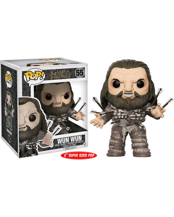 This Game of Thrones Wun Wun 6 inch Pop Vinyl is perfect for fans of the series. This super sized figurine depicts Wun Wun, possible the last giant in Westeros, looking angry and with arrows poking out of him. The Pop! Vinyl measures approximately 15cm tall and comes packaged in a windowed display box.