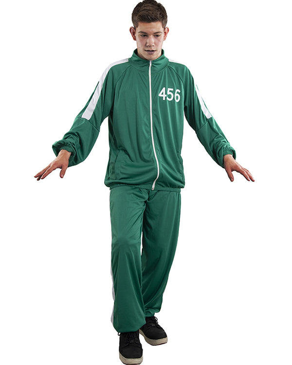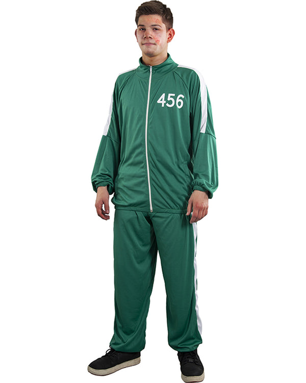 Survive the death games and win a huge piggy bank of money in this Game Show Tracksuit Green Tracksuit Mens Costume. The costume comes with a matching green tracksuit including a jacket and pants with white panels and the number '456' printed on the chest. Add your own white T-shirt underneath and white sneakers and get ready to play. The perfect costume for Halloween or a TV show-themed party.