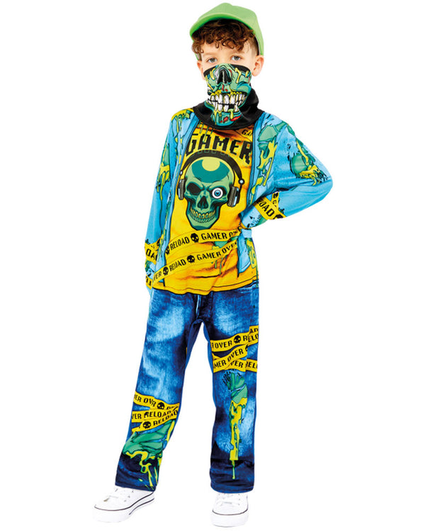 Get ready to conquer Halloween with this Gaming Zombie Boys Costume. This full length jumpsuit is designed to look like a separate shirt and denim jeans, for a gamer approved look. The jumpsuit features fun prints of yellow tape with the words “Game Over” and “Reload”, along with yellow and green zombie blood, and a gamer skull. To complete the look, also included is a skull print fabric face mask, so everyone knows you're the coolest gamer out. Your little zombie gamer will be ready to haunt the neighbourhood, collecting treats and declaring a spooky game over for Halloween night.