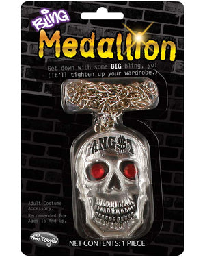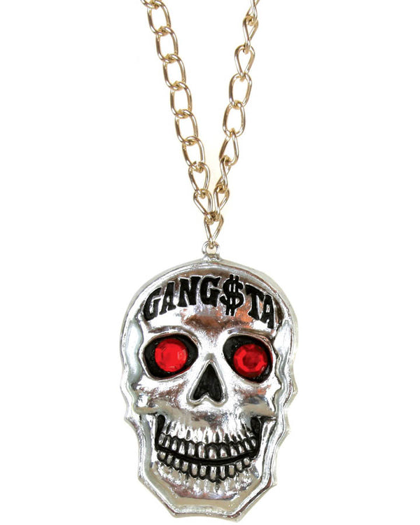 Add some bling to your gothic look this Halloween with this Gangster Gothic Medallion. Features a silver skull with red jewel eyes and 'Gang$sta' written across the top attached to a 15"/38cm long silver chain.