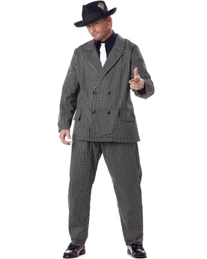A double-breasted pinstripe suit, Gangster Mens Plus Size Costume is a classic 20s outfit. The matching jacket and pants have a real Capone look to them, and a black dickey (shirt collar) with white tie is included. Now get your hands up!