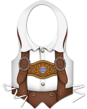 This plastic German waistcoat plastic vest with ties is the perfect quick fix costume accessory. The vest makes it appear as though you're wearing lederhosen without the fuss of buckles and buttons. Ideal for any Oktoberfest or German themed party. This plastic bib-style vest is features a digitally printed transfer image that is backed with interfacing for support. For ease of wear, the vest also has string attached to ensure that it stays in place. This vest is a great option for a quick, cheap and easy themed costume and while putting in minimal effort so you can spend more time having fun! Great for bar staff and waiters at a themed event!