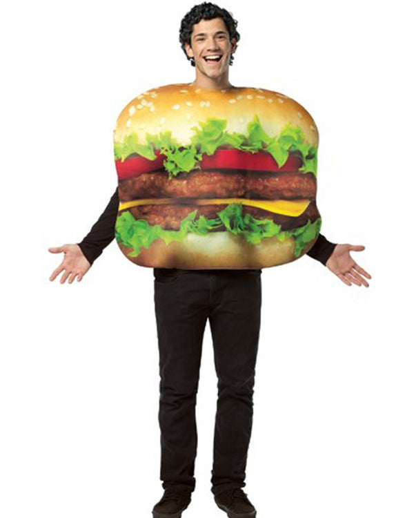 Look good enough to eat in this Get Real Cheeseburger Adult Costume. The comfy tunic features a polyfoam front with a digitally printed photo real image of a cheeseburger with all the appropriate fillings. Delicious details like lettuce tomatoes a patty and sesame seed buns will make you look good enough to eat. Don't be afraid if someone tries to take a bite.