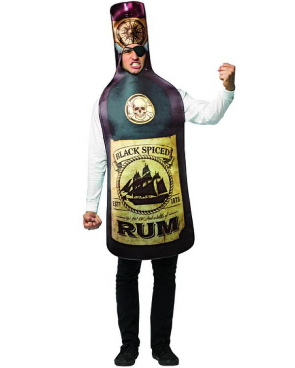 This Get Real Rum Bottle Mens Costume is sure to go down smoothly at your next dress up party. The tunic features a photorealistic print of a bottle containing black spiced rum with pirate-like motifs of a skull and crossbones, compass and black ship. A black eye patch is also included to complete the costume.