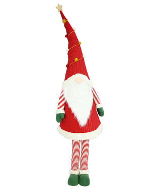 - Giant Santa gnome decoration with red cable-knit shirt and tall hat.