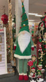 - Giant gnome decoration with green cable-knit shirt and tall hat.
