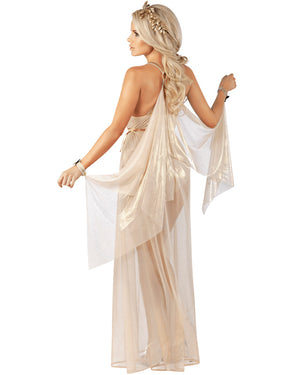 Show off your heavenly status in this Gilded Goddess Womens Costume. The costume includes a gold mesh romper with plunging neckline and mesh lace applique on the front. Attached to the romper are gold wrap around waist ties as well as an attached gold mesh layer skirt and arm drapes with wrist straps. To complete the look, also included is a gold laurel leaf headpiece.