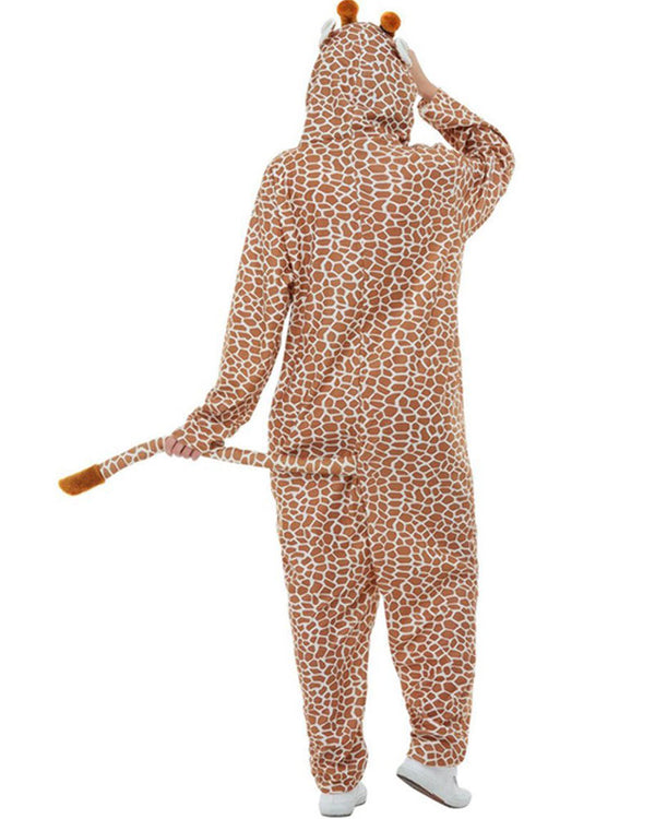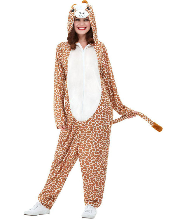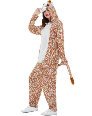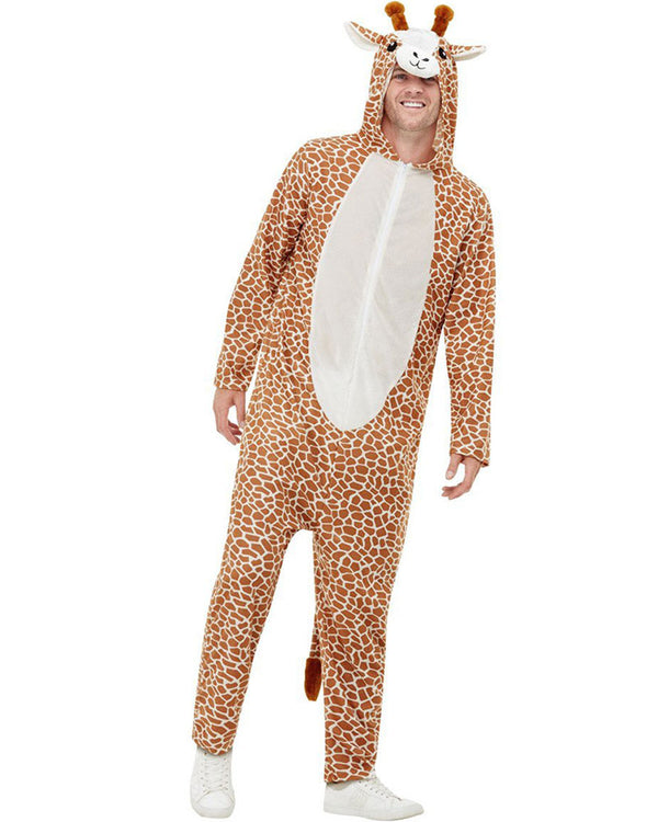Become the tallest and...wobbliest..animal in the safari wearing our Giraffe Adults Costume. This Giraffe Adults Costume is perfect for your next animal, safari, or zoo-themed party. The costume is a jumpsuit that has a spotted giraffe print with a white coloured stomach, a front zipper and attached with a giraffe's tail, and a hood with a cute face with ears.