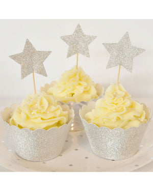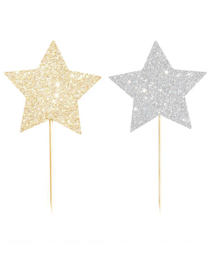 Stick these charming little Gold and Silver Glitter Stars Reversible Cupcake Toppers into your cakes for an extra special touch. Match up with the other cake and party tableware in the Gold and Silver Glitter range for a totally co-ordinated party look.