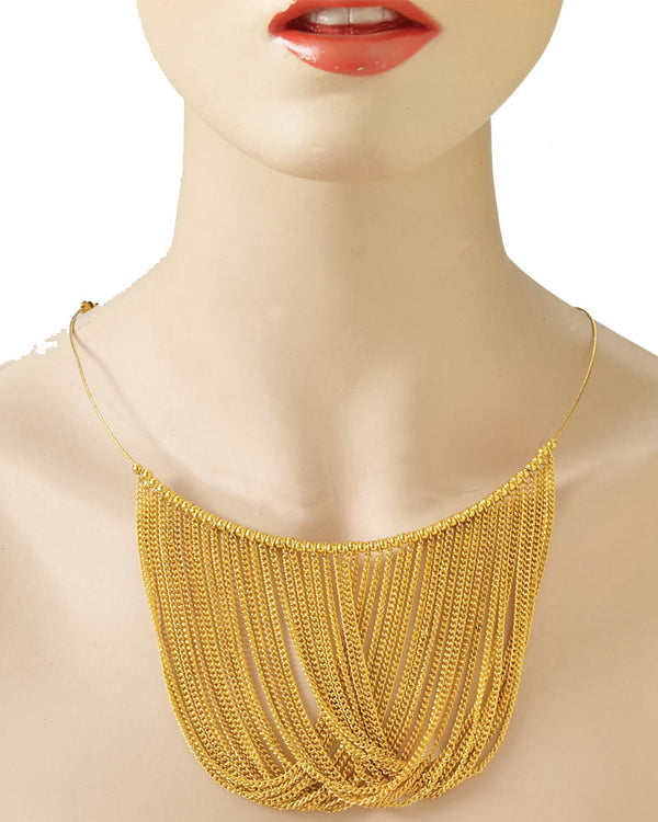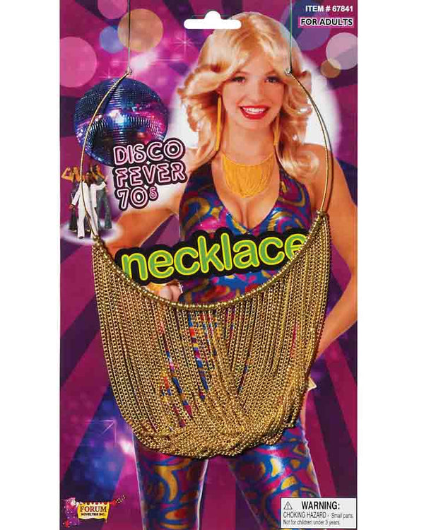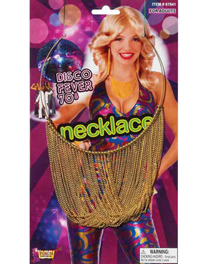 Have all the perfect Disco Diva accessories for your 70's themed costume or party. The necklace features a thin gold loop that is open at the back with lots of smaller gold chain hanging from it. Bring on the disco fever.