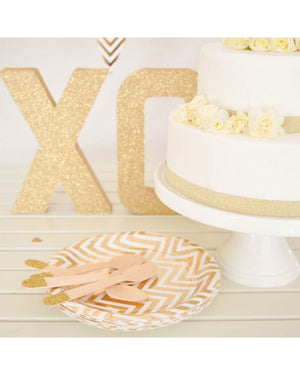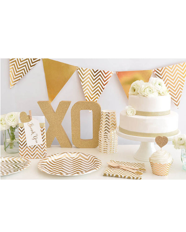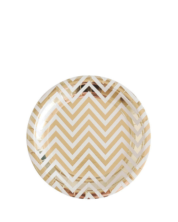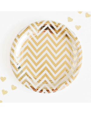 These Gold Chevron 18cm Paper Plates will make your table look great no matter what you're celebrating. The high-quality plates feature a gold foil chevron pattern and come in a pack of 10. Match with our other gold foil party supplies for a coordinated look suitable for all occasions.