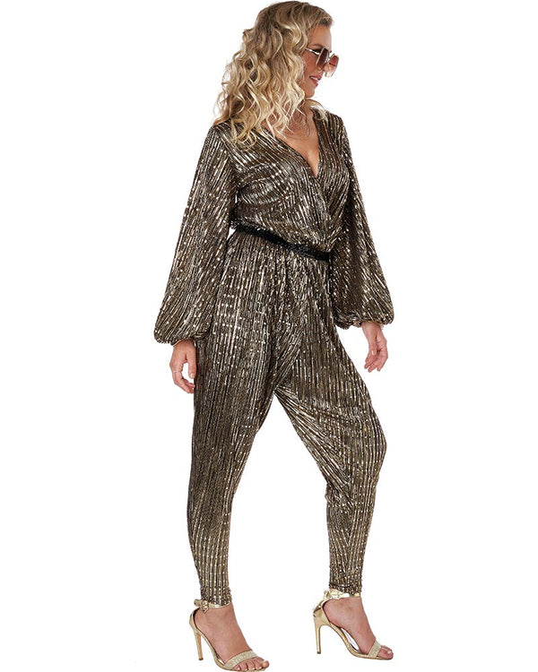 The time to boogie is now and this Gold Disco Queen Womens Costume is perfect for looking the part. The black and gold jumpsuit is full length and features baggy sleeves, an elastic waist and a cross-over front. Also included is a black sequined belt with velcro closure. Perfect for any 70s party or disco theme - even to look sparkly on New Years Eve!