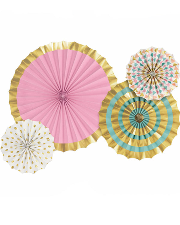 Add some exotic flair to your party with our Pastel and Gold Foil Hot Stamped Paper Fans Pack of 4. This pack of 4 varying sized fans feature an assortment of polka dot, triangle, and solid design and are ideal decorations for birthday parties and special events.