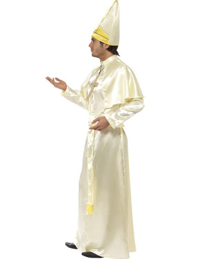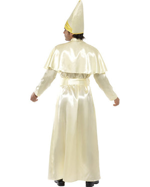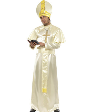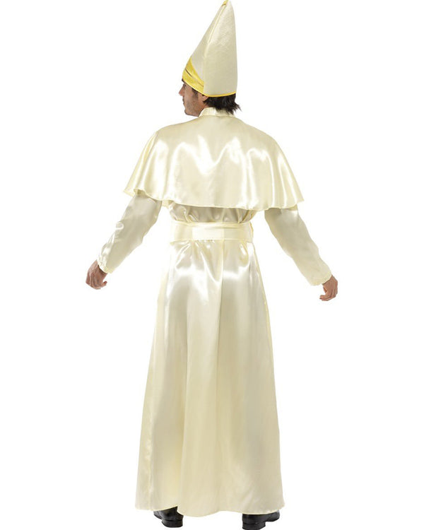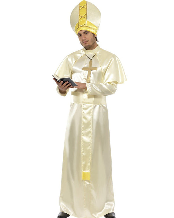 Become the leader of the Catholic Church in this Gold Pope Mens Costume. This holy costume includes a cream coloured silky full length robe with long sleeves, a short cream coloured silky cape to drape over your shoulders and a silky gold sash to wrap around the middle. Also comes with a tall replicate Popes Mitre hat in cream, yellow with gold detailing and a large gold cross necklace. Going your bible and bless other party guests as you enter the celebrations.
