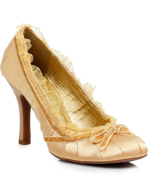 These Gold Renaissance Heel Womens Shoes are the perfect finishing touch for your historical elegant costume. These gold heels are covered in a satin gold material, with gold velvet framing the opening and attached to a velvet bow on the top. Along the opening is a gold lace ruffle trim and the heel height is 10cm high. An excellent accessory to your ballroom, renaissance, princess or fairytale outfit.