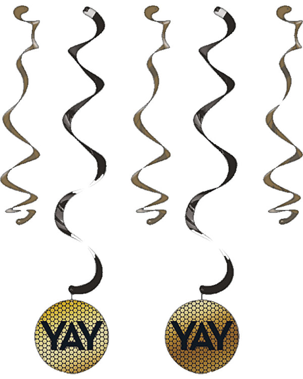 Dazzle your guests with this Golden Gala Hanging Swirl Decorations Pack of 5. This pack of hanging swirls contains three metallic gold swirls and two black stand out swirls featuring a circular print with the phrase "Yay" in black letters. For a truly decadent design combine this with some of our gold and black party supplies including party cups, party plates, tablecovers and more.