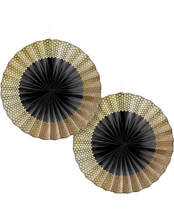 Wow your guests with this Golden Gala Paper Fans Pack of 2. Comprised of two identical and interesting paper fans, each with a stylish black center and a golden foiling around the edge that exudes class and sophistication. Perfect for impressing guests all the way from the buffet to the backyard these decoration items are a brilliant final touch. For a truly decadent design combine this with some of our gold and black party supplies including party cups, party plates, tablecovers and more.