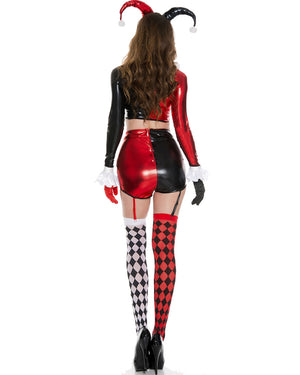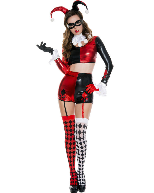 This Gorgeous Harlequin Womens Costume is perfect for your next fancy dress party. The costume comes with a two-tone red and black metallic crop top with long sleeved and ruffled white cuffs and matching high waisted booty shorts with attached garter straps. Also included is a matching black and red jester hat headband, a white jester neck piece, a black glove and a red glove, and mismatching coloured diamond print thigh high stockings. The perfect costume for Halloween, carnival parties or even classic Harley Quinn cosplays.