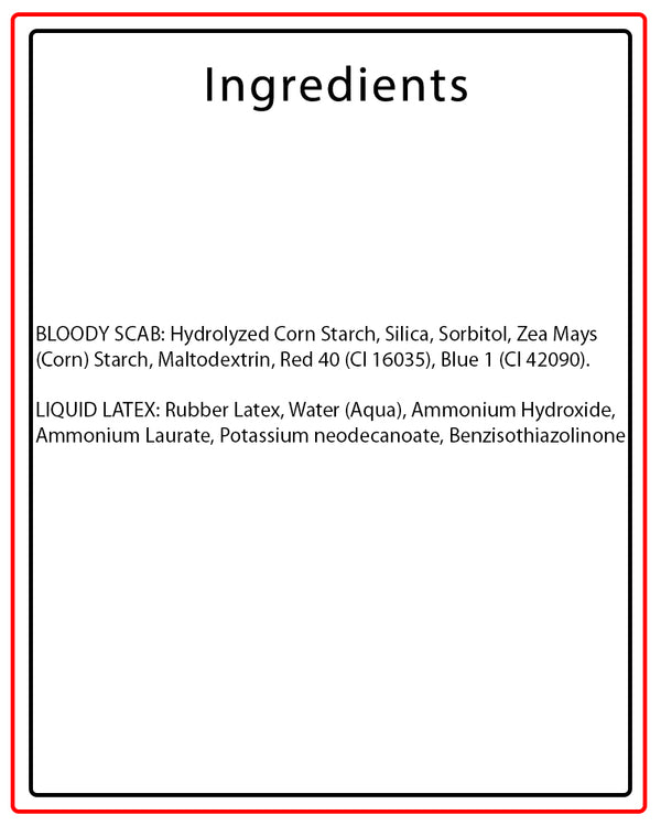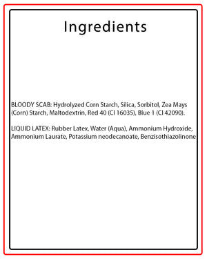 Ingredients: BLOODY SCAB: Hydrolyzed Corn Starch, Silica, Sorbitol, Zea Mays (Corn) Starch, Maltodextrin, Red 40 (CI 16035), Blue 1 (CI 42090). LIQUID LATEX: Rubber Latex, Water (Aqua), Ammonium Hydroxide, Ammonium Laurate, Potassium neodecanoate, Benzisothiazolinone.