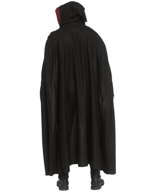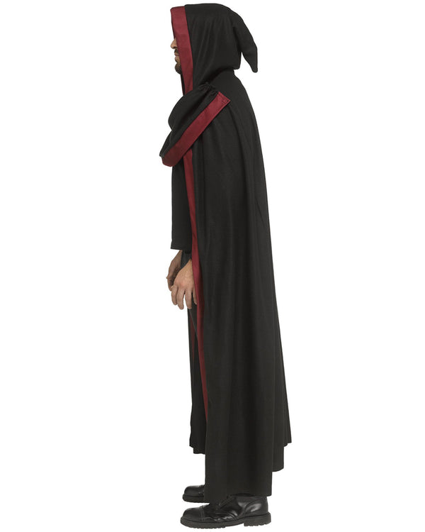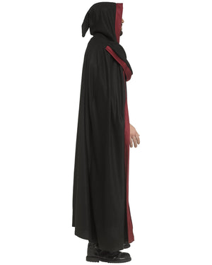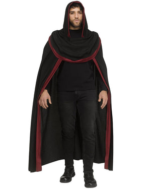 Present yourself in true regal style with the Goth Lord Hooded Mens Cloak, an exquisite piece that showcases both power and mystery. This black hooded cloak, adorned with rich red satin-like trims, transforms you into a figure of noble authority and gothic allure. Complete your look with your finest silver weaponry and armour. Whether for a Renaissance fair or medieval themed party, this cloak is perfect for adding a touch of majesty to your look.
