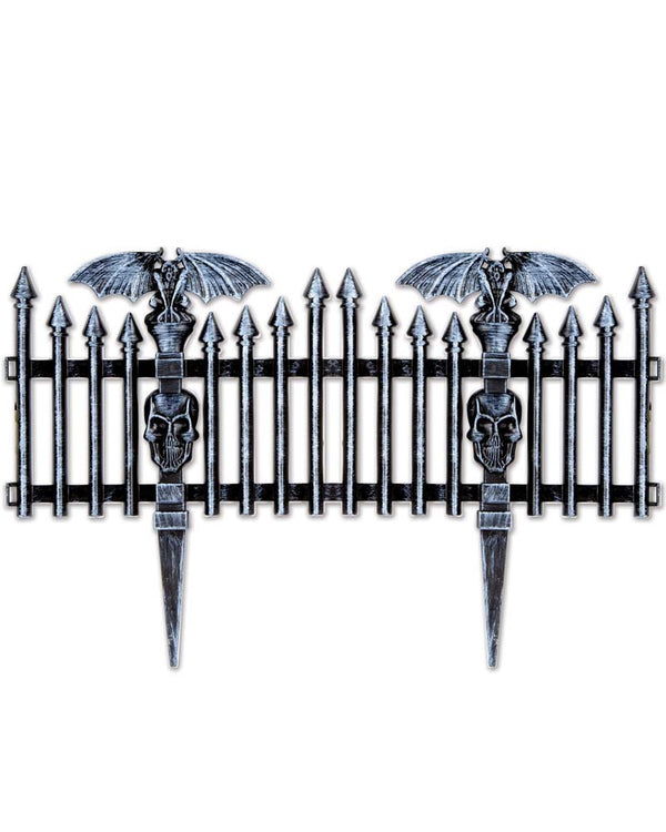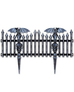 This Gothic Fence looks like something straight out of 13th century France and is the perfect decoration for your Vampire themed Halloween party! This spiked fence is made of plastic and features bat and skull detailing and a weathered black finish. Simply use the attached stakes at the bottom to firmly secure into the ground.
