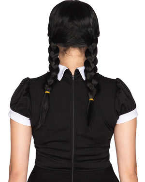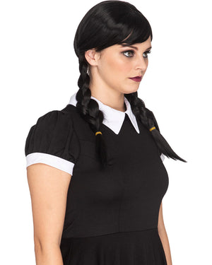 This Gothic Girl Deluxe Plaited Black Wig is the perfect way to complete your Wednesday Addams or Oktoberfest costume. This gorgeous black wig features two thick plaits that come down just past the shoulders and a side-parted front fringe. This wig is also a fantastic option for other character cosplays or even just to wear to change up your everyday look! A bonus wig cap is included for added comfort and to keep your own hair under wraps.