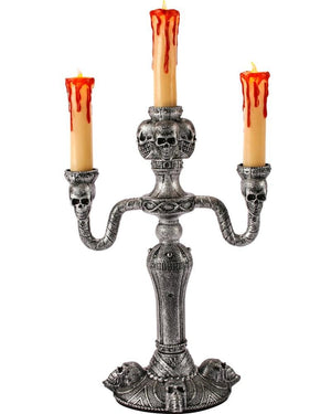 - Light Up Candelabra: Romantic dinner for two? Not quite, but this prop will certainly set the scene for your haunted house or Halloween party! Our Light Up Candelabra features a three arm candlestick holder with LED flames that light up. Small skulls decorate the holder which has an antiqued appearance to give it that olden day style. Requires 2 x AAA batteries (not included).
