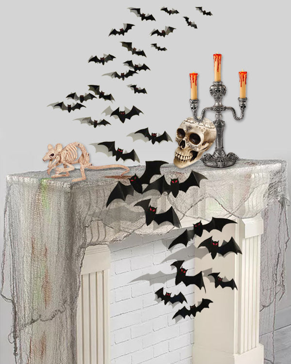 This Gothic Mantel Kit is the perfect starter kit to get your Halloween decorations underway for any Haunted House. Hamper includes: Light Up Candelabra, Grey and Green Gauze Drape Curtain 2.4m, Ornate Carved Skull 14cm, Bat Cutouts Value Pack of 30, Skeleton Creepy Crouching Mouse Prop.