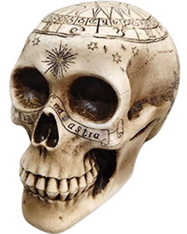 - Ornate Carved Skull 14cm: Master of Mystics. This Ornate Carved Skull 14cm is perfect for use as a Halloween decoration. The skull prop comes in a realistic bone colour with slight ageing detail, as well as featuring ornate mystical carvings so it'll look like you're using the skull for special incantations. Place on a tabletop, in a graveyard or as part of a creepy voodoo or pentagram spell setup. Combine with our range of skeleton or witch party supplies including party cups, party plates, tablecovers and more.