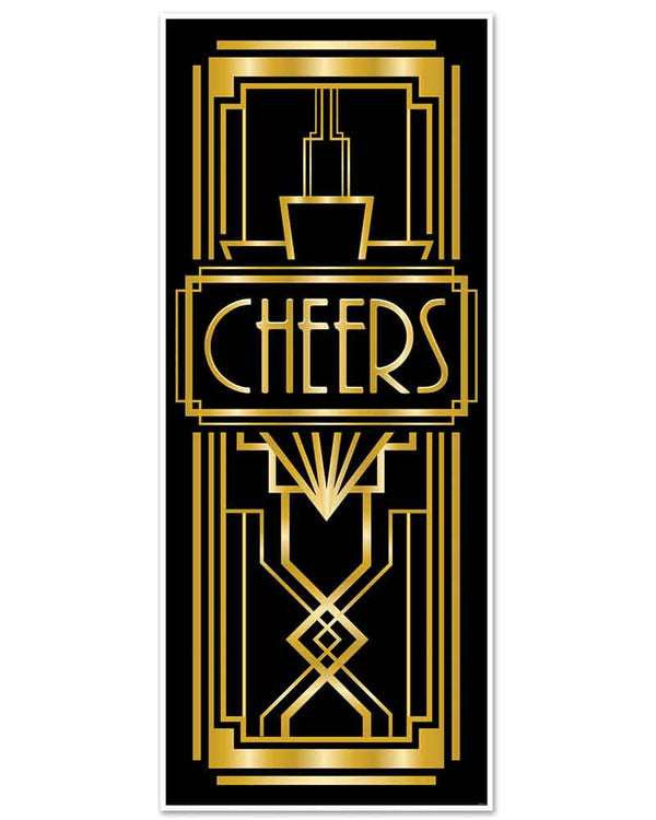 Decorate your 1920s or Hollywood theme party with this Great 20s Door Cover. This door cover is made from plastic, features a black and gold print with a "Cheers" headline in the center and is great for both indoor and outdoor use.