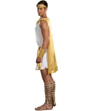 You may think you are God's gift when you don this Greek God Mens Costume. The outfit includes a white tunic with an attached gold cape and gold trim around the hem. A gold sash, gauntlets and leaf design headpiece finishes off the look in style.