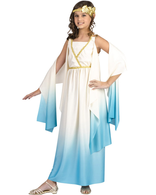Have your people feeding you grapes and carrying you away in your chariot in this beautiful Greek Goddess Girls Costume. The costume includes a blue and white silky gown with gold accents and leaf headband.