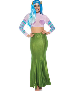 Swim through the depths of the ocean and seduce passing ships in this Green Shimmer Spandex Mermaid Skirt. This green shimmering mermaid skirt is made from spandex material and features a high waisted fit and flairs from the thighs for a tail effect. Create your own mermaid look by completing your look with a shell bra, bright coloured wavy wig, and shell accessories. You will find all you will need in our mermaid's accessory range.