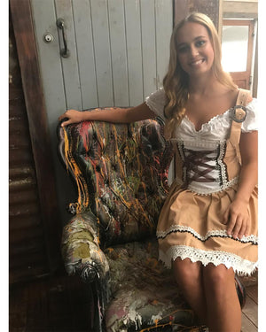 Gorgeous Gretl could be gorgeous YOU! This soft and absolutely stunning Gretl Oktoberfest Dirndl Womens Costume is made for women who want to add a little sexy this Oktoberfest. If you're looking for a more modern, but comfortable take this Oktoberfest then the Gretel Dirndl is for you! The underbust, drop waist dress is made from soft caramel coloured faux suede and has chocolate and cream lace decorating the hemline and bodice. The faux lacing of the bodice is held together by silver toggles decorated with rhinestones. Each of the dress straps have eyelets and a buckle so that you can make the dress as short or long as you like! To finish off the look is an anglaise lace off the shoulder crop top. The perfect blend of cute and sexy, just add some killer heels and do your hair up nice! What a look.