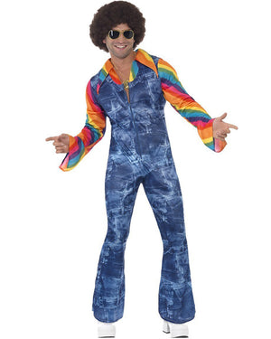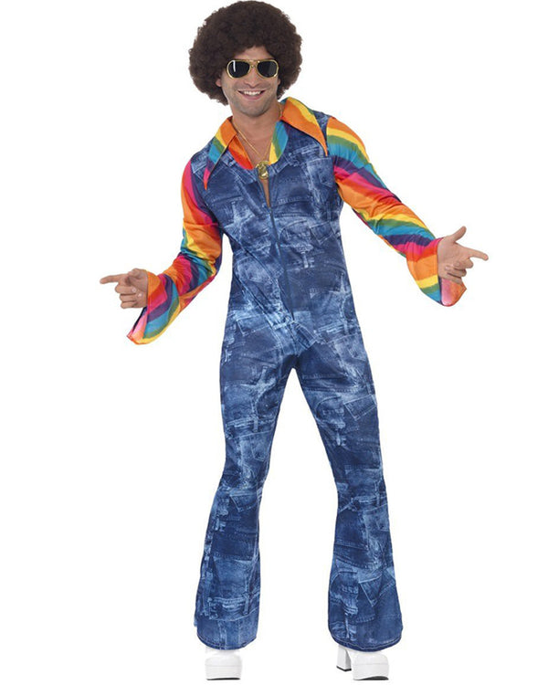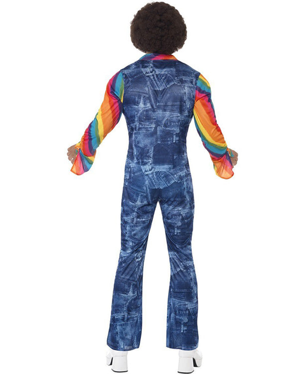 Get ready to groove like never before with this 60s Groovier Dancer Men's Costume! This far-out ensemble is designed to transport you back to the psychedelic '60s with its denim-look printed jumpsuit. Featuring rainbow sleeves and collar, this jumpsuit exudes retro charm and disco fever. Perfect for men ready to hit the dance floor and spread peace, love, and funky vibes, whether it's for a themed party, a dance-off, or just a night of groovy fun.