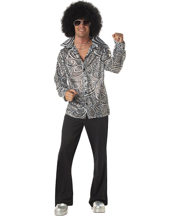 Get down to business in this Groovy Disco Mens Shirt and Wig Set! Perfect for your next '70s themed disco party. This groovy disco costume features a black and silver swirl patterned sequin shirt and a crazy black afro do. Just add the right moves and dance to those funky hits in a pair of flare pants.!
