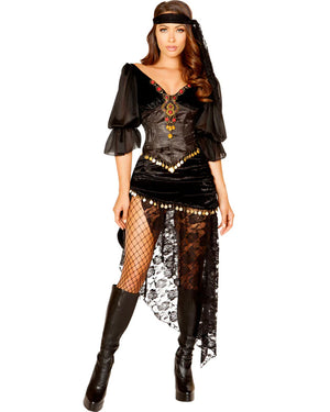 You'll have a line out the door with those wanting to know their futures when you wear this Gypsy Maiden Womens Costume. The costume includes a black top with puffed three-quarter sleeves, an attached waist cincher featuring gold coin trimming and a jewelled neckline, as well as a matching double-layered skirt with black velvet around the hips, a trimming of gold coins and an asymmetrical lace underskirt and matching black headband. Pair it with stockings and boots, as well as a magic crystal ball to complete the look.