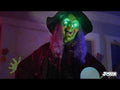 Unleash dark magic this Halloween with this Hanging Animated LED Witch with Magic Ball 2m. The witch is cloaked in a black and purple robe, her purple hair cascading from beneath a black witches hat. She clutches a glowing magic ball, illuminating the night. Her eyes glow green with haunting intensity, and with a motion-activated sensor, she erupts into cackling laughter and creepy fortune-telling phrases. With posable arms and an attached string for easy hanging, this witch is ready to cast a spell of fear over your Halloween decor.