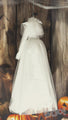 - Hanging bride dress animatronic with lace detailing, tulle, flower accents and a pearl necklace.