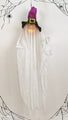 - Hanging pumpkin man animatronic draped in white cloth and topped with a purple witch hat.