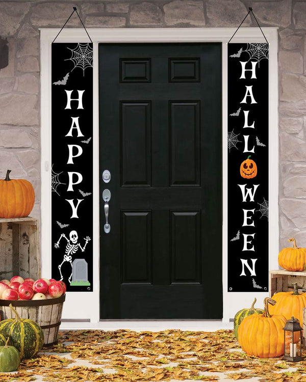 First impressions are important, so have your guests greeted with this Happy Halloween Home Door Banners Pack of 2. Featuring two black rectangular banners, one reads “Happy” and the other “Halloween.” The banners are adorned with spooky graphics of spiderwebs, bats, pumpkin, skeleton and a tombstone, for an extra touch of Halloween fun. Place yours on the front door or anywhere that needs a little Halloween magic. Style with other great Halloween decor to really get into the spirit of things.