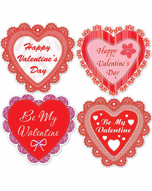 Large and easy to see, this doublesided Happy Valentines Day Lace Heart Cutouts Pack of 4 is perfect for anyone wanting to add a little romance to their Valentines Day. With four different varieties of lace look-a-like cardboard cutouts in each set, there's something for everyone.
