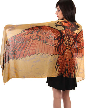 The perfect accessory for any fan is this Harry Potter Fawkes Lightweight Scarf. The large scarf features a print of Fawkes the phoenix with his wings fully extended on a beige background. This can be worn as a scarf or shawl.