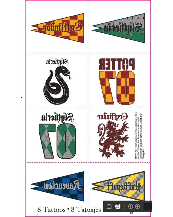 Show your Hogwarts pride with this cool set of Harry Potter Tattoo Favours Pack of 8. With flags for each of the houses, as well as a Gryffindor and Slytherin Quidditch number and crest, this set of tattoos has something for everyone!
