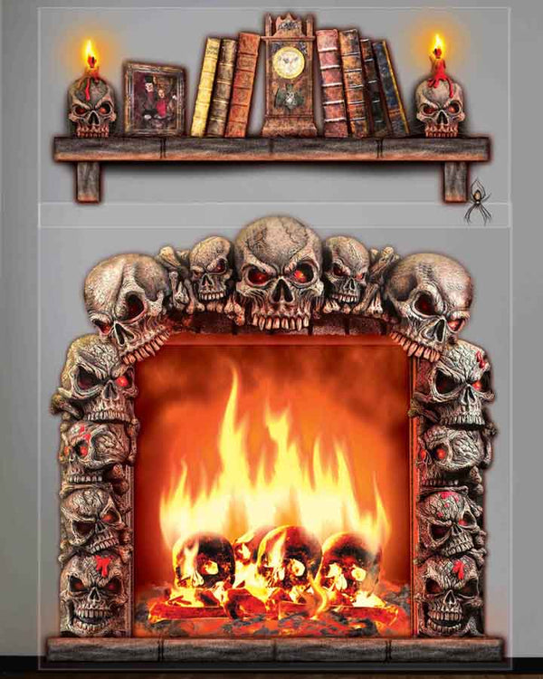 Create a creepy atmosphere with this Haunted Fireplace Wall Decoration. Made of a thin plastic material featuring a crackling fireplace surrounded by skulls and an old wooden bookshelf above, this decoration will attach easily to most flat surfaces. Two pieces when put together cover 20 square feet. Can be used inside or outside.